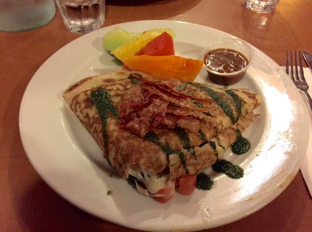 Nonetheless, my food eventually came. The presentation of the Buffalo Crepe looked amazing. It was layered in a triangular shape, with bacon strips and pesto sauce slathered over it. On the side, there were 4 different types of fruits and a sauce pan of buffalo sauce. The crepe was cooked to near perfection, with a golden-brown outside that made it even look more appetizing. Taking my first bite, I instantly tasted the cheese, since it dominated the entire inside of the crepe. Not only did I taste the saltiness from the ham and turkey, but I could also taste hidden sourness and spiciness from the tomato. The mushroom and spinach also contrasted with the crispy texture of the crepe itself. It had the right amount of everything to really achieve that rich, cheesy taste the crepe was supposed to have. However, the only downside was that the content inside fell apart when I cut into it.