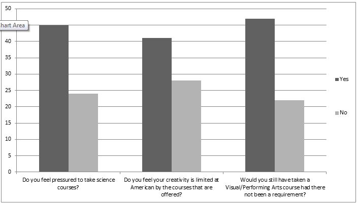 In the school graduation requirements, four years of science is recommended, whereas students only have to take one year of a visual/performing arts course. Since liberal arts is not as emphasized, not many students take these kinds of courses all four years. However, an online poll revealed that only 68% of students would take a liberal arts class even if the school did not require it.