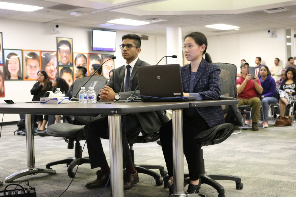 Caption: SURFBoardE representatives Pallas Chou and Zuhair Imaduddin address the school board during their presentation regarding the calendar shift. “By having the calendar moved forward, we hope that winter break will prove to be a more natural transition between first semester as well as second semester,” stated Chou (12).
