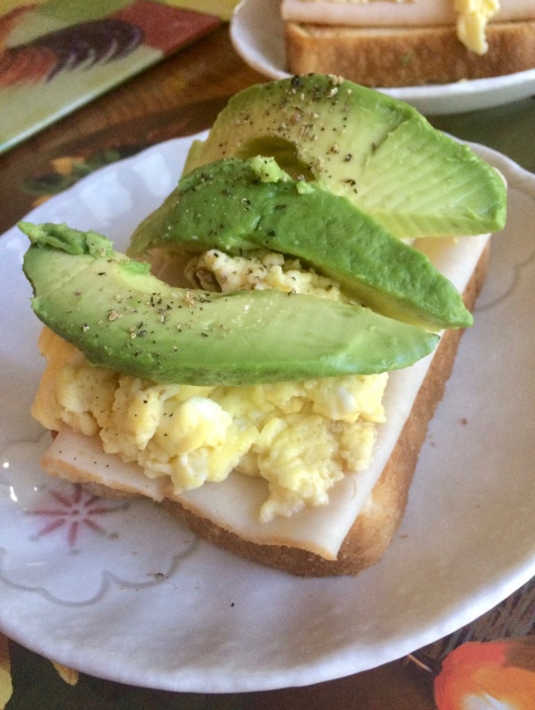 12:05pm: Well I took a long time to pamper myself in the bathroom so I ended up walking downstairs to the kitchen at around 12:05pm. I cracked an egg into the bowl and beat it to a yolky consistency. I turned on the stove and began to make myself some scrambled eggs. Next, I took out the turkey and placed it on a plate. While the eggs were cooking, I cut open an avocado and sliced it into smaller pieces. When the eggs were done, I toasted a piece of bread, put everything on top, and garnished with salt and pepper.