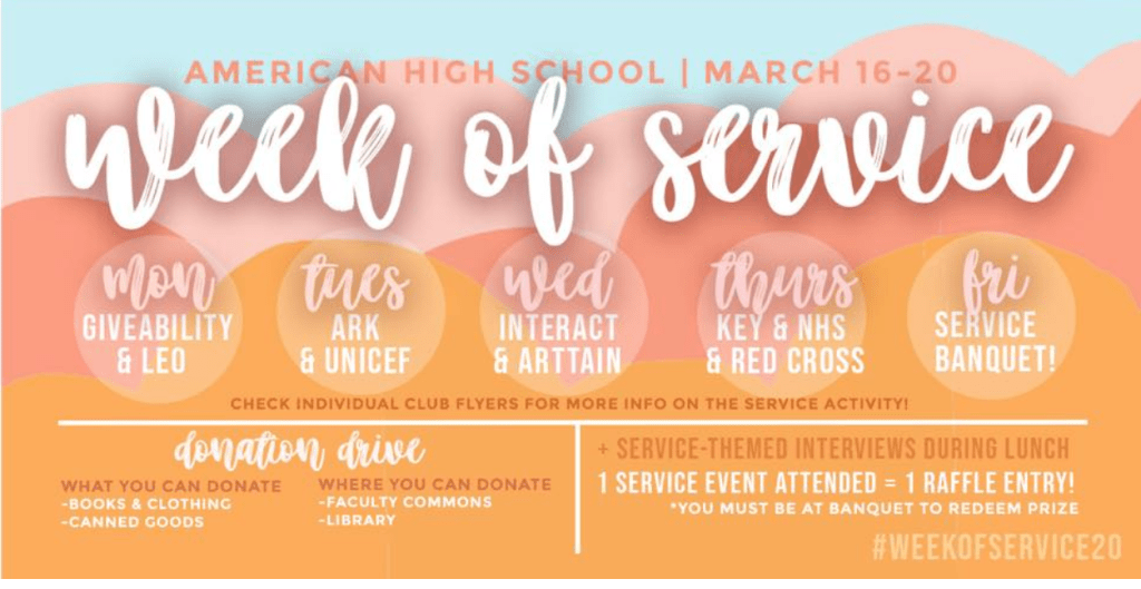 Out of nowhere, many students began to see Instagram stories that said “Three days left.” With a confused mind, many people probably just swiped left and continued to see other stories. What many don’t realize is that these posts hint at the start of the Week of Service.