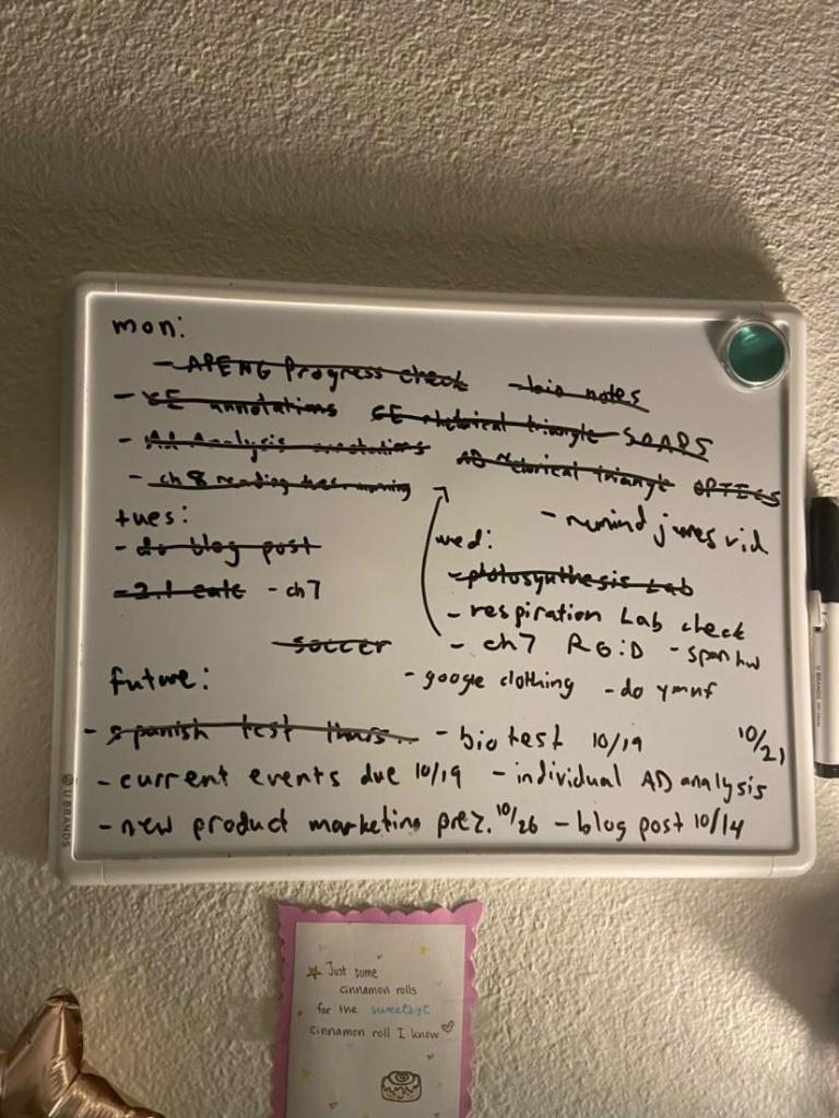 The urge to procrastinate can be a difficult habit to break, but there are many ways to work around that temptation. Alison Clarke (11), another junior taking AP English, shares her way of avoiding the temptation to procrastinate. “I need to distract my brain because when homework is due in two hours and you have four hours of work, you get it done somehow. You just grind the work. I trick my brain into doing that two days ahead,” she laughs. “You’re the most productive right before it’s due. You just get that adrenaline of ‘Oh shoot.’” Castellana finds that taking breaks when she’s stuck on assignments helps her from putting off the assignment entirely. “Sometimes if I’m like, ‘I cannot do this right now. I’m wasting time,’ I just watch an episode of a TV show, and then I usually take a 15 to 20 minute break. So I’m like, ‘Okay, at this time, I will stop.’ So I put an alarm on my phone to be like an ‘oh, get back to work’ kind of thing.”