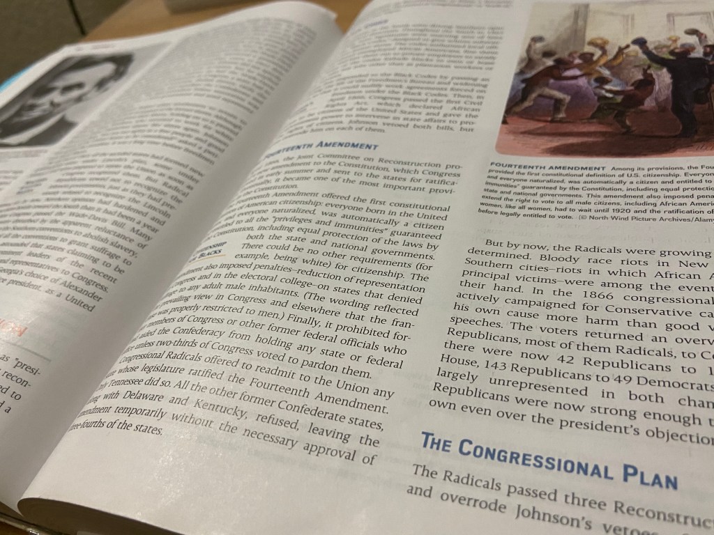 Saachi Baldwa (11), who is currently in the AP U.S History class, cited a quote from her textbook; she says, “The textbook spent a few pages talking about Jim Crow and the KKK and all these atrocities that Black people had to go through, but the last sentence of the chapter, the last impression they leave the in readers with is, ‘the commitment to white supremacy, in short, was a burden for poor whites as well as for Blacks.’ I interpreted this as people who participated in white supremacy suffered similarly to the people who were the victims of it? That really bothers me. It just really minimizes the damage done to African American communities.”