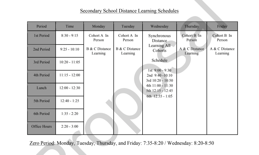 The number of cohorts will be based on those electing to enroll in the hybrid program. The proposal uses an example of three cohorts, A and B in hybrid and C as full distance learning. Each hybrid cohort would have two days of in-person instruction and one synchronous class day when all cohorts would meet online only. The plan requires teachers to teach both in-person and online at the same time.
