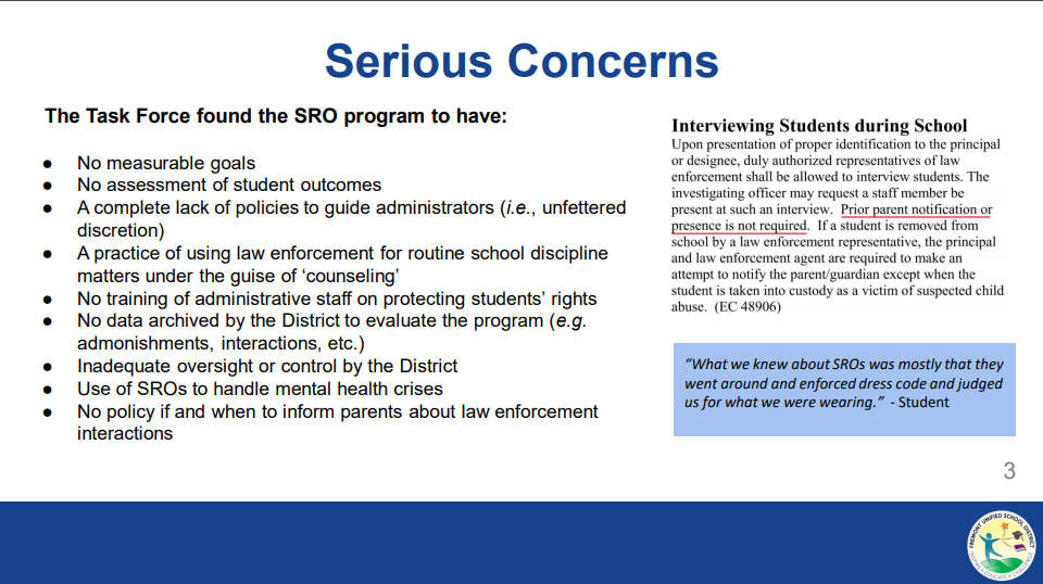 For context, according to the Fremont Police Department’s website, the SRO program makes up $838,000 of the 2020-2021 FUSD budget. The program in whole, however, costs a total of $2.5 million, with the contribution of both the FPD and FUSD. In abolishing the SRO program, I, along with other students, hoped this would go towards funding mental health programs and alternatives. Examples include increasing the number of mental health professionals, de-escalation training for staff, and developing restorative justice programs. In response to the voices calling for the abolishment of the SRO program, FUSD took a step in the right direction, and created an SRO taskforce to reevaluate the program and make recommendations. In their evaluation, their very first recommendation was to remove the program altogether. With its removal, they found that with the program’s funding, more counselors and professionals could be hired. “The entire amount paid by FUSD for the SRO program could fund full-time Healthy Choice mental health interns in every school with money left over. For every SRO that FUSD pays for, we could hire between 1.5-3 mental health counselors or school nurses and 1.5-2.5 school psychologists.” the task force states in their report. Their additional concerns are listed below.