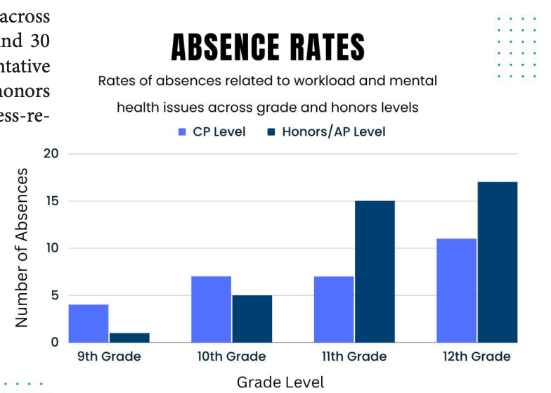 Amongst a group of about 60 fresh-men, half being in a CP level English class and the other in an Honors level class, despite over a third taking more than one accelerated class, 26% of students who have taken a day off this year were absent due to stress or workload related issues. Between similarly sized sophomore CP and honors-level English classes, results show that around 51% of students are taking more than one advanced course. Out of the sophomores who were surveyed, only 30% revealed that they have been absent to catch up on work or take a break for their mental health.