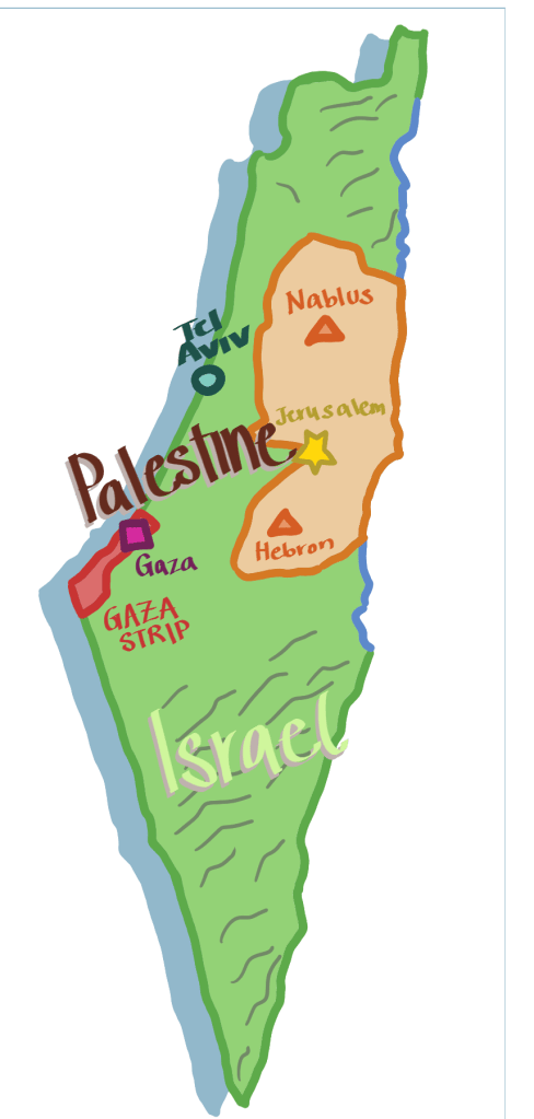 Caption: The infographic of the land between the Jordan River and the Mediterranean Sea shows the current labeled territories of Israel and Palestine. (Art credit: Jessica Li)