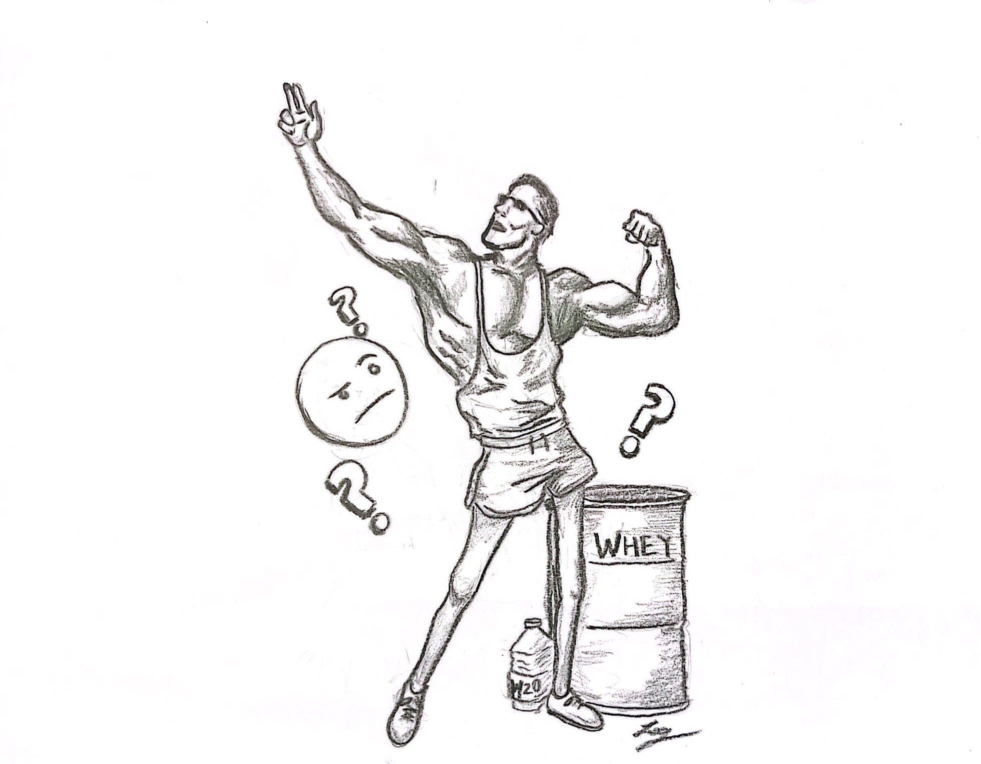 Caption: Will a barrel of whey a day really fulfill your happiness? Or will it brainwash you into an endless fit of flexing and finger-guns. Art Credit: Logan King