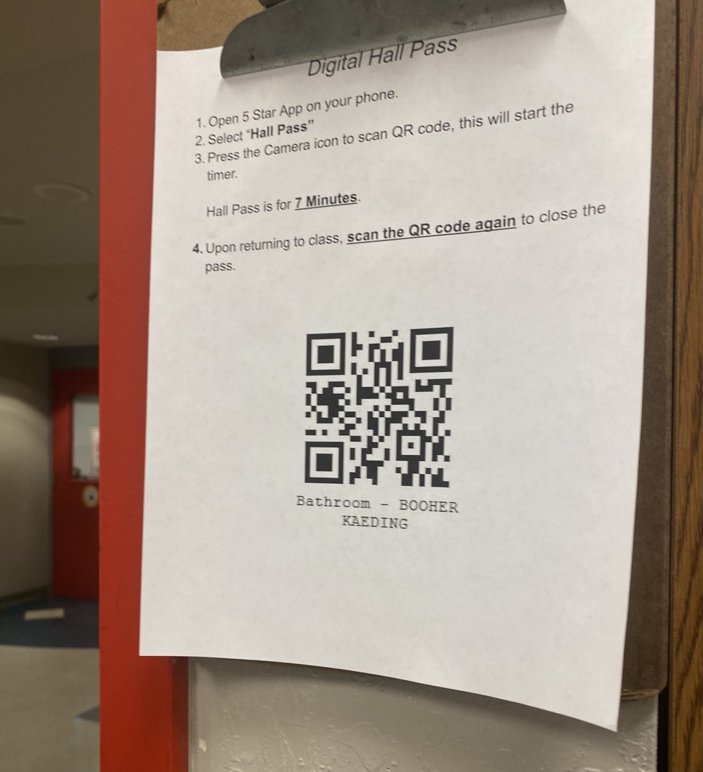 The new bathroom pass at our school, with a seven minute time limit and location tracking capabilities, turns using the restroom into a stressful tribulation. This system brings up questions about trust and the balance of efficiency and respect. (Photo Credit: Ryan Liu (10)).