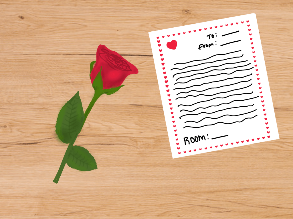 A single red rose and a handwritten note delivered as a thoughtful Valentine’s gesture to students and staff (Art Credit: Carolyn Baskar John (11)).