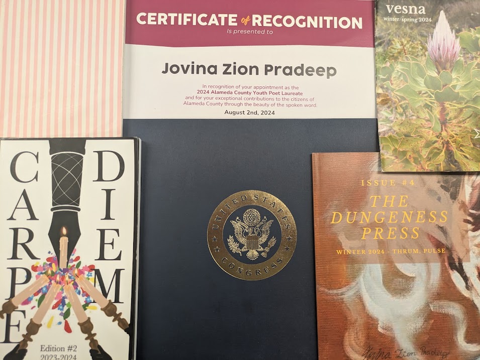 From top left, clockwise: one of Pradeep’s poetry notebooks, the Alameda County Youth Poet Laureate’s certificate of recognition, AHS’s Winter-Spring 2024 Vesna magazine, the Winter 2024 Dungeness Press, an envelope sent to Pradeep from Representative Eric Swallwell, and the Dead Poets Society’s 2023-2024 chapbook. Pradeep’s work has been published in the magazines pictured (Photo Credit: Aruna Harpalani (11)).