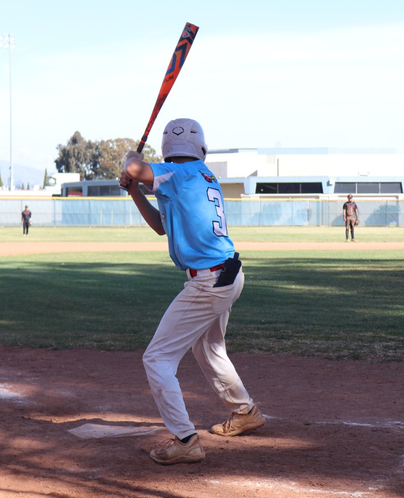 While Maverick Pinkevich (#23) supported the team from the dugout, Justin Furtado (#1) made three plate appearances, garnering two strikeouts (Photo Credit: Nanki Kaur (12)).
