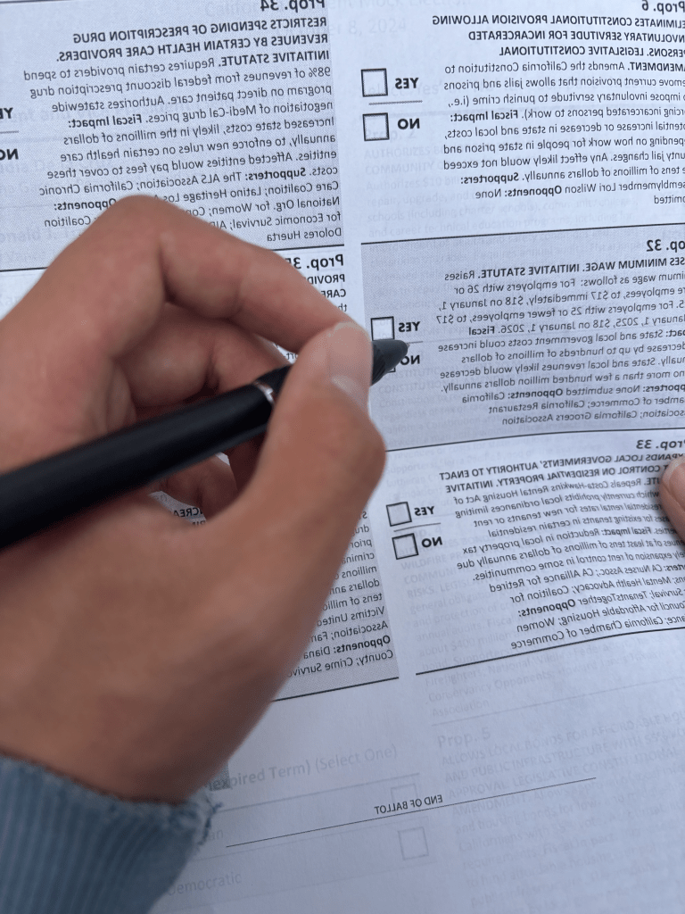 Thomas Lin (12) looks over the 2024 election ballot. He said, “The political issue I’m most concerned about is any world wars that could break out. There has been conflict between Ukraine and Russia since I was in middle school, and currently there has been conflict with Israel and Palestine and heightened tensions with China” (Photo Credit: Jonathan Wang (12)).