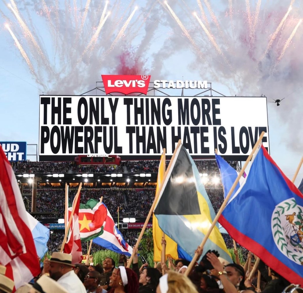The message, “The only thing more powerful than hate is love,” was displayed on the screen as Bad Bunny concluded his performance with his hit song, “DtMF” (Photo Credit: Variety).